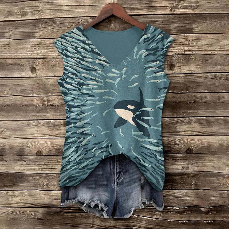 Vintage Rhombic Seafood Collection Print V-neck T-shirt