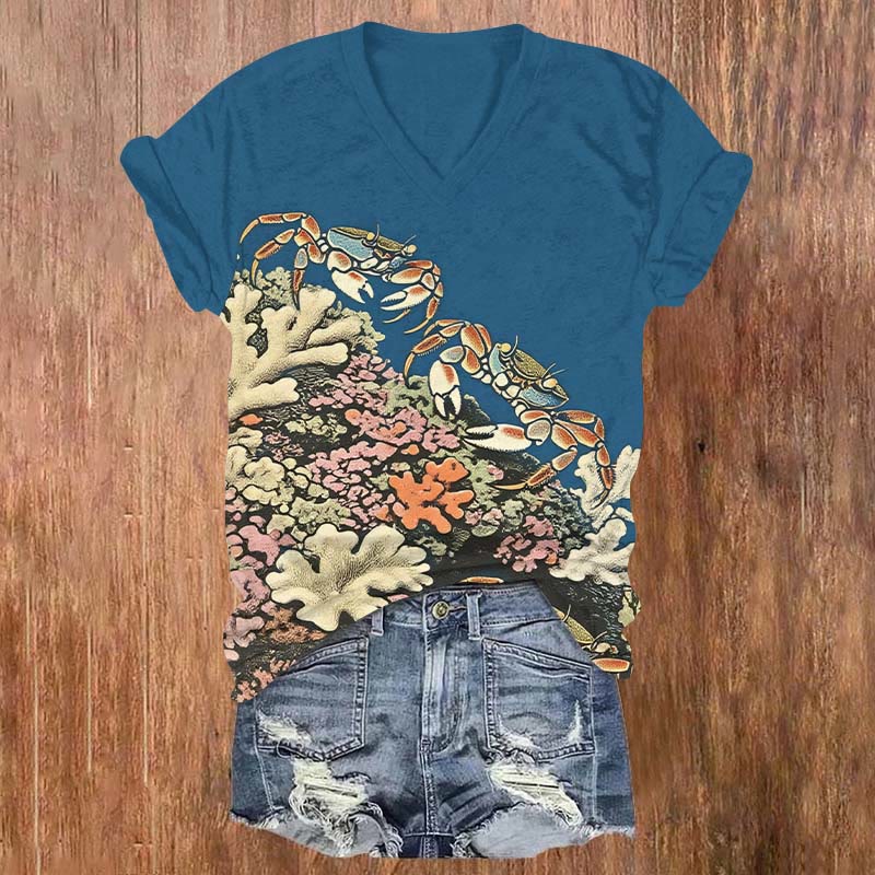 Creative Colored Cartoon Crab & Coral Print V-neck T-shirt