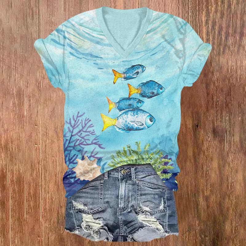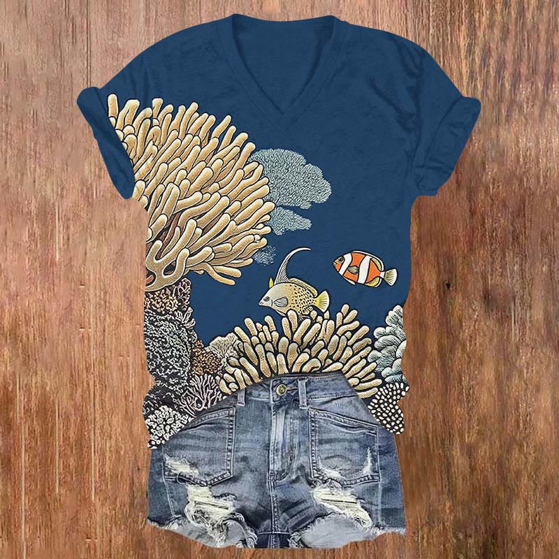 Vintage Underwater Fish & Coral Print V-neck T-shirt