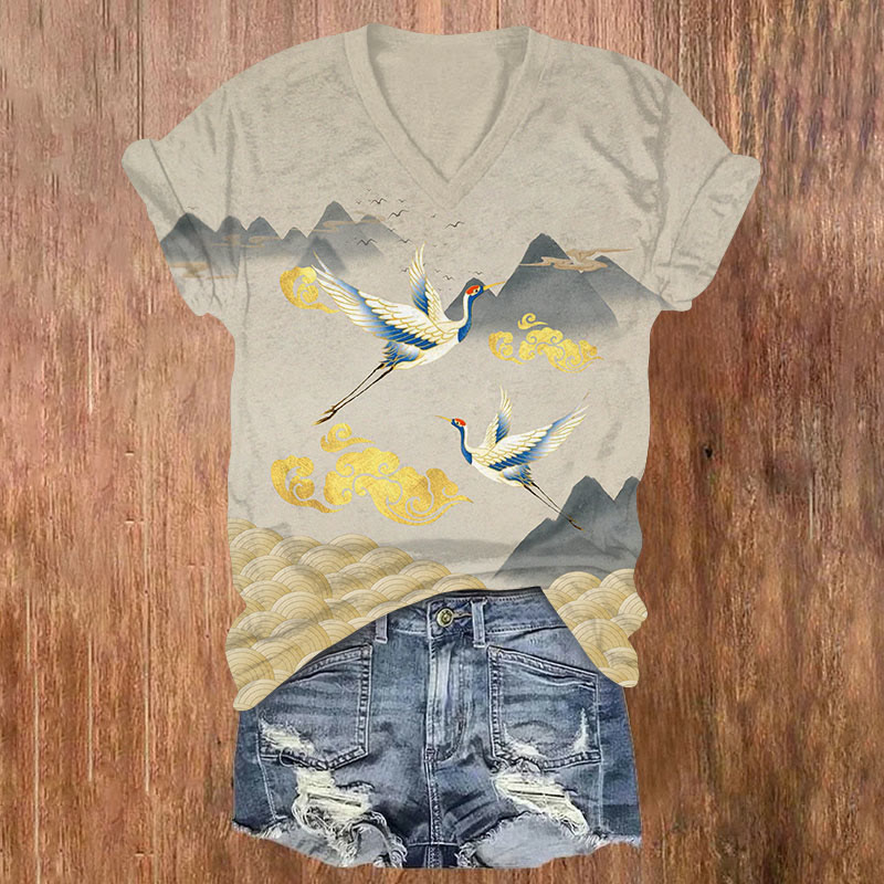 Flying Cranes Japanese Art Graphic Vintage Print V-neck T-shirt