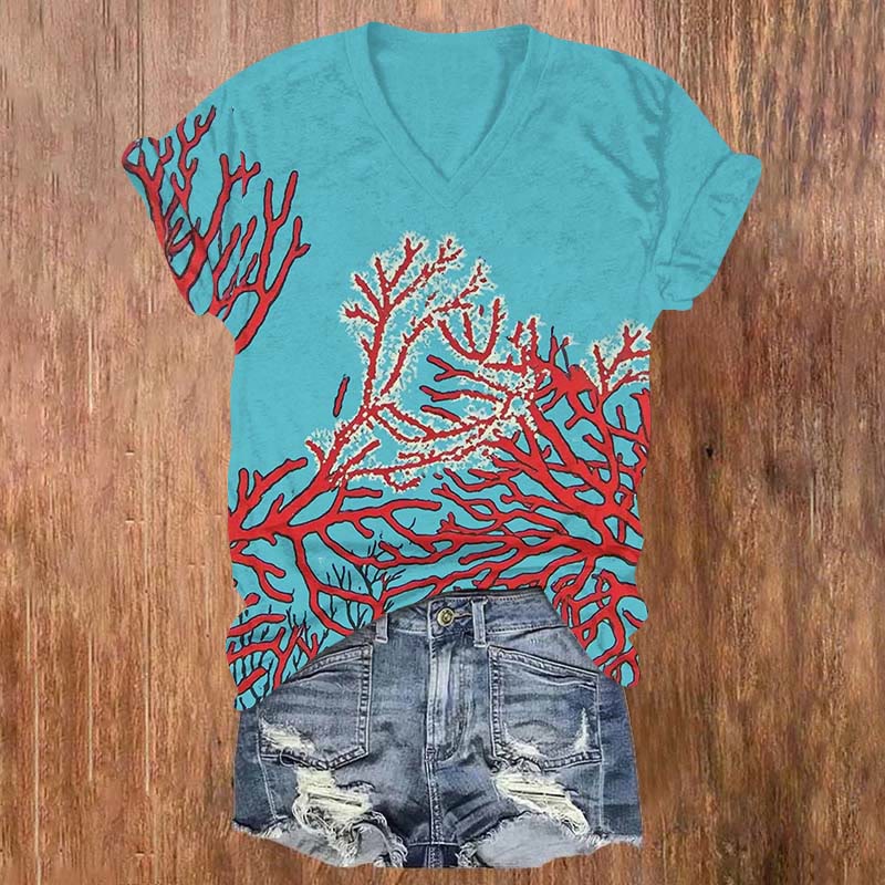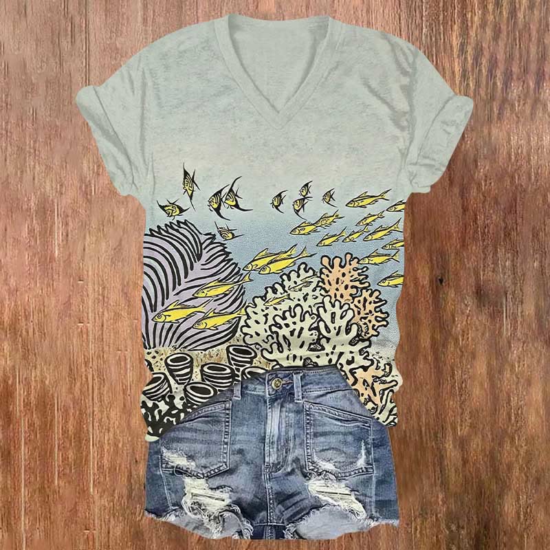 Vintage Ocean Fish School & Coral Art Print V-neck T-shirt