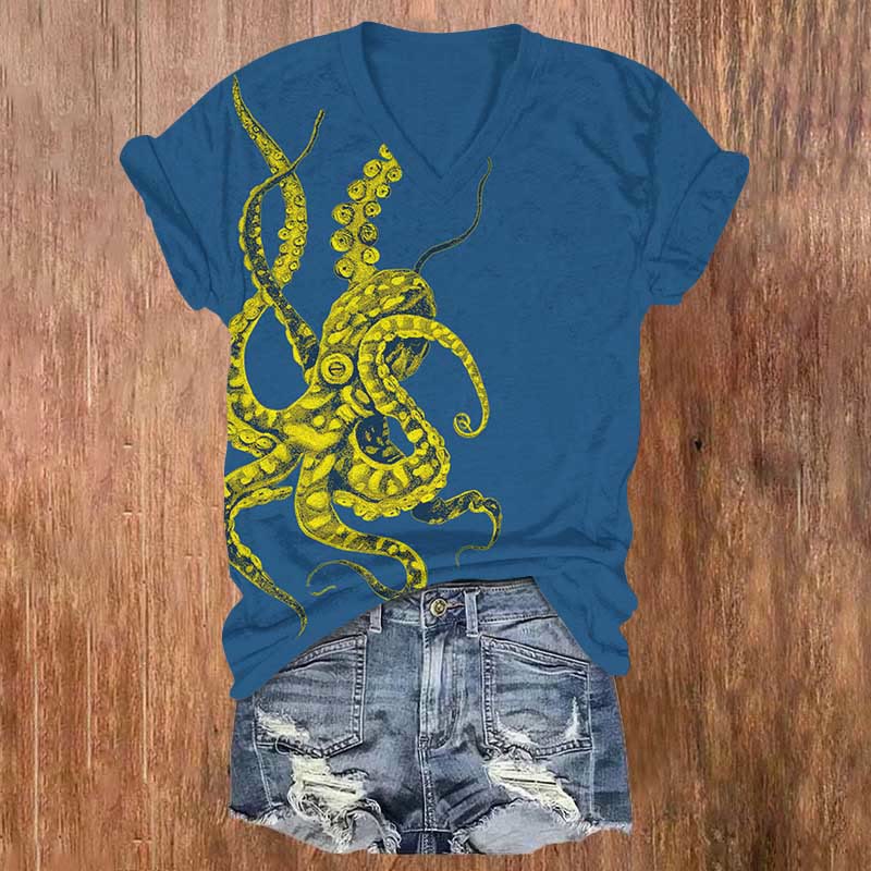 Vintage Watercolor Octopus Print V-neck T-shirt