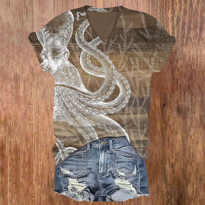Vintage Wide-eyed Octopus Print V-neck T-shirt