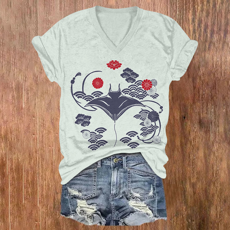 Goldfish Sakura Fan & Sun Print V-neck T-shirt