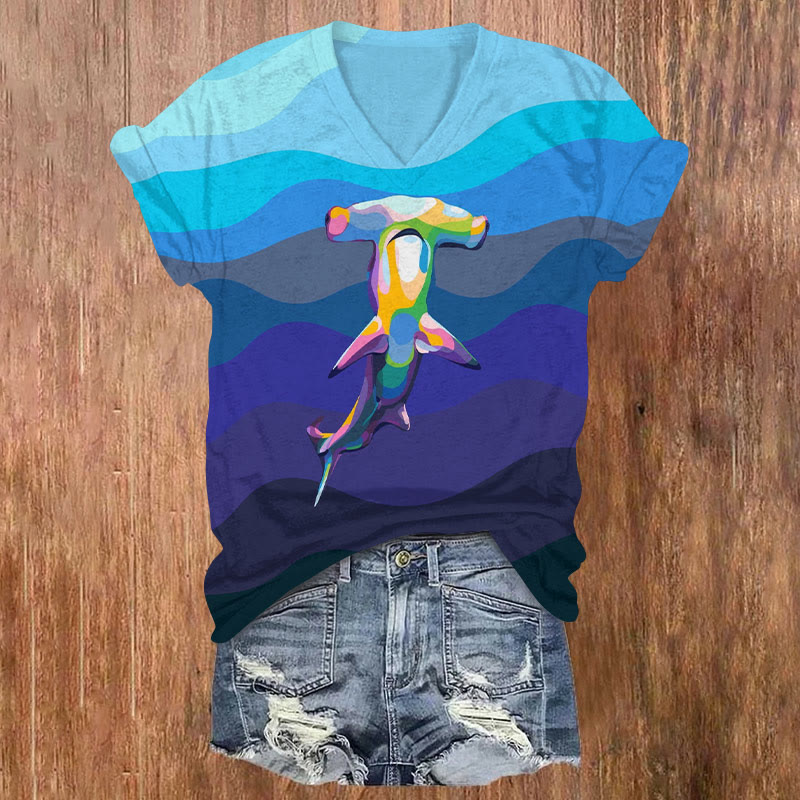 Ombre Geometric Shark Print V-neck T-shirt