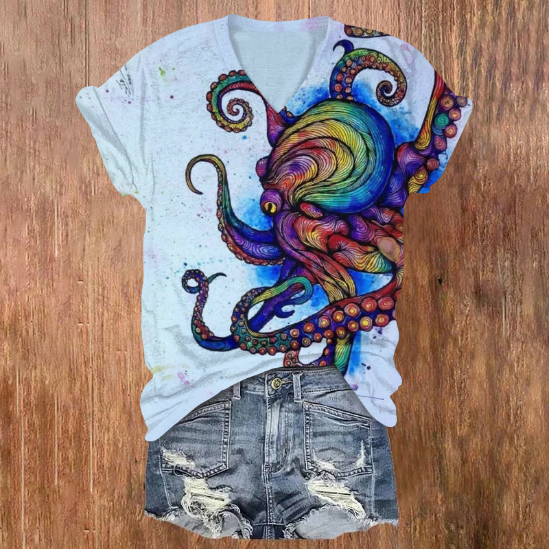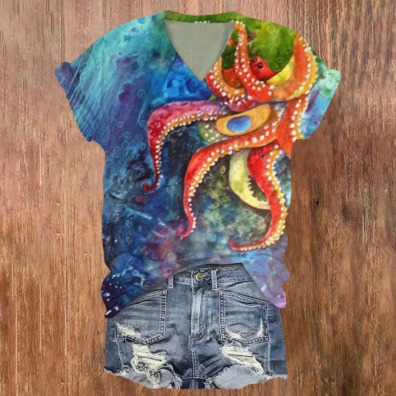 Watercolor Contrast Octopus Print V-neck T-shirt