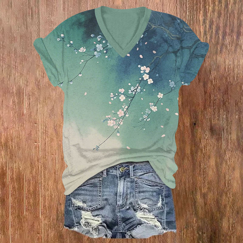 Butterfly Among Plum Blossoms Print V-neck T-shirt