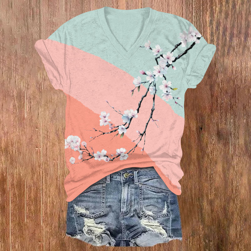 Japanese Vintage Sakura Colorful Art Print V-neck T-shirt