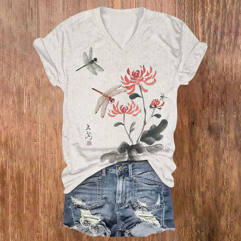 Japanese Vintage Dragonfly & Flowers Art Print T-shirt