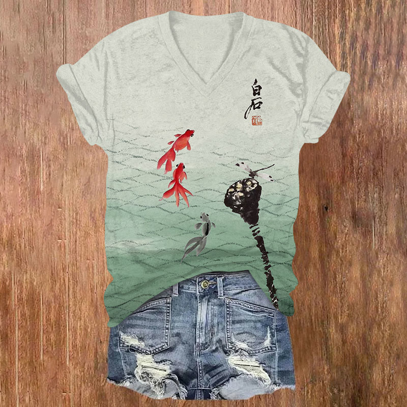 Vintage Wave Swimming Goldfish Art Print V-neck T-shirt