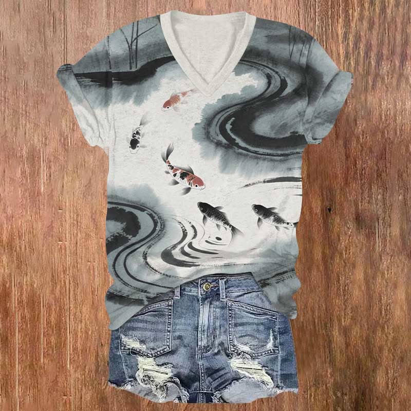 Ink Splash Pond & Koi Art Print V-neck T-shirt