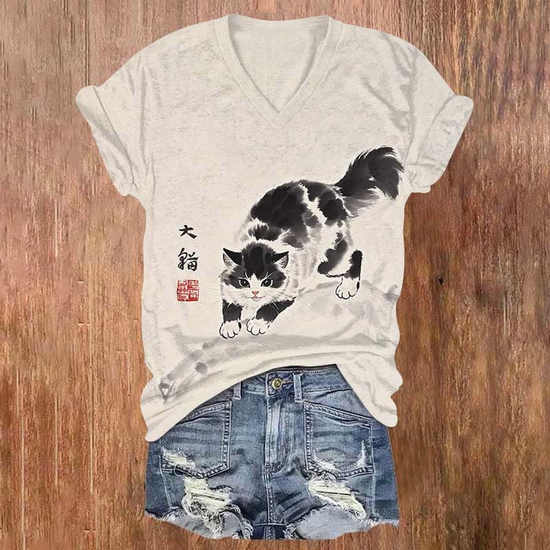 Japanese Vintage Ink Watercolor Cat Art Print V-neck T-shirt
