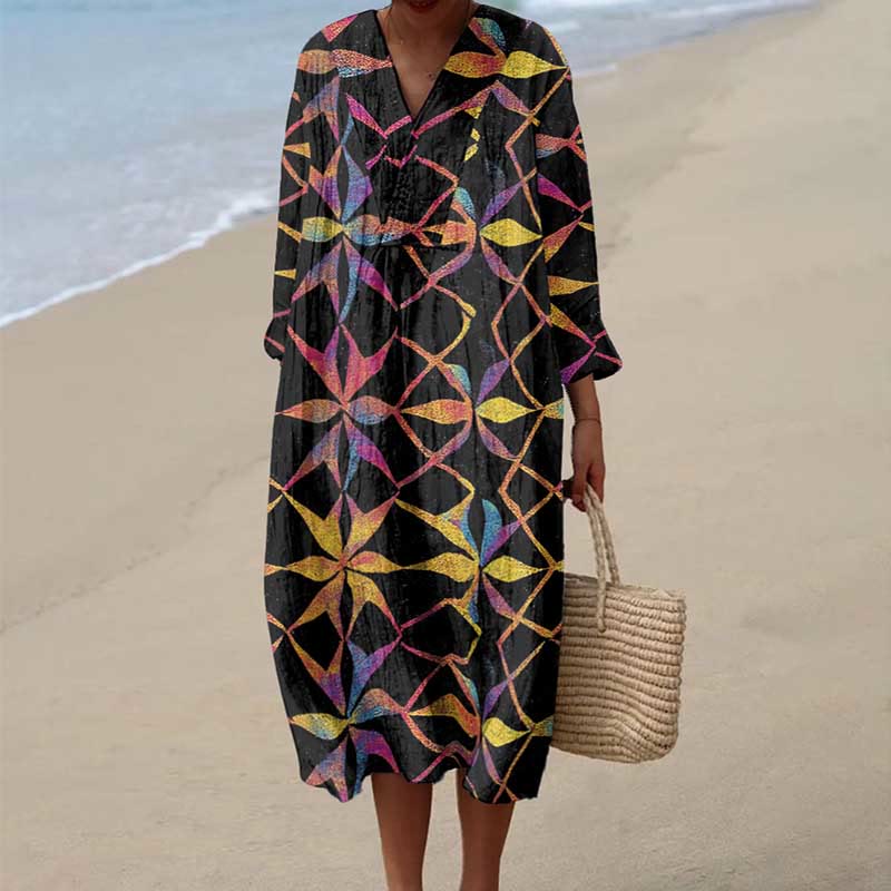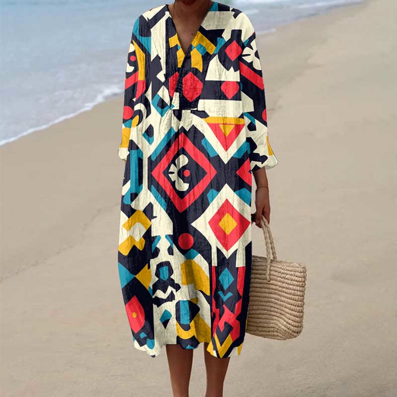Women's Vintage Contrast Ethnic Geometric Pattern Art Print Dress