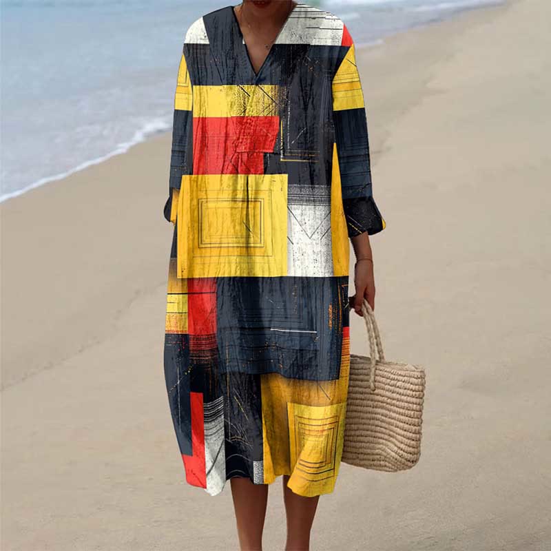 Women's Vintage Contrast Patchwork Geometric Pattern Art Print Dress