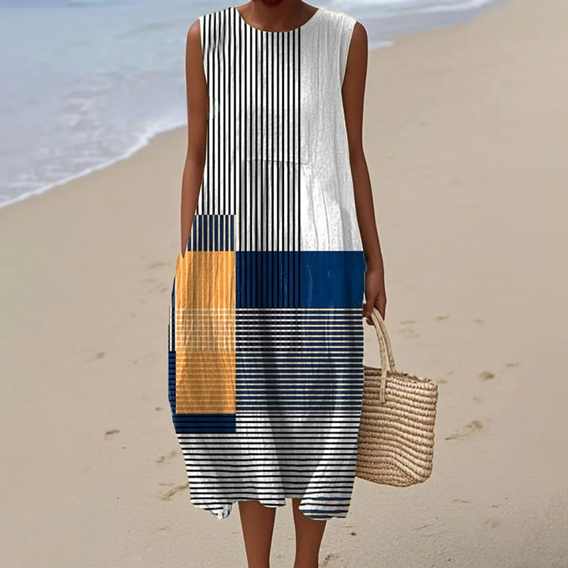 Women's Vintage Contrast Striped Patchwork Art Print Sleeveless Dress