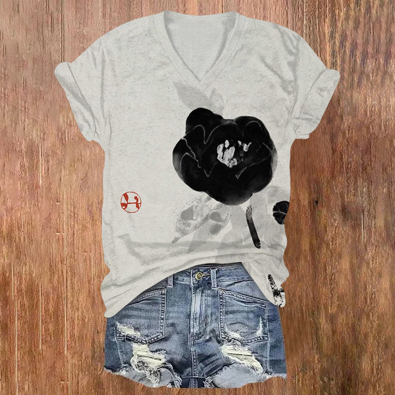 Vintage Watercolor Camellia Print V-neck T-shirt
