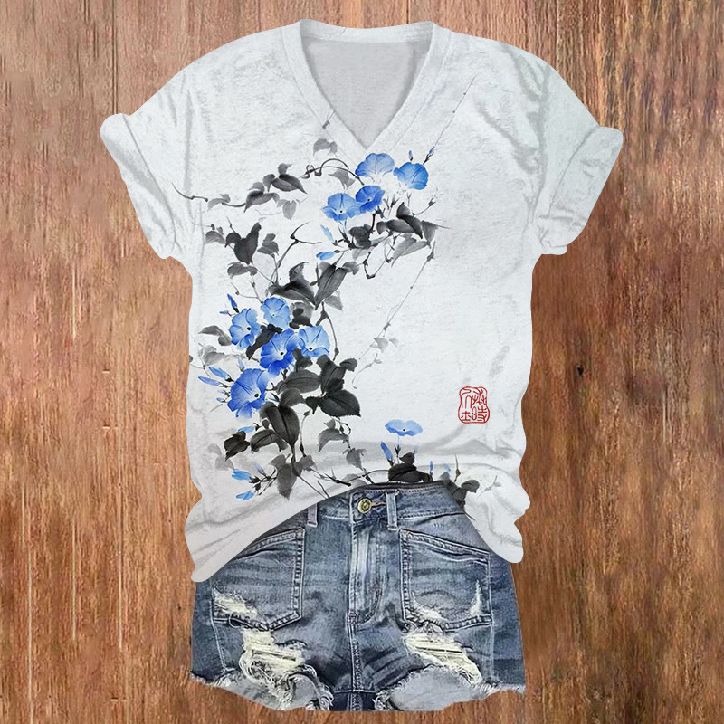 Vintage Watercolor Morning Glory Print V-neck T-shirt