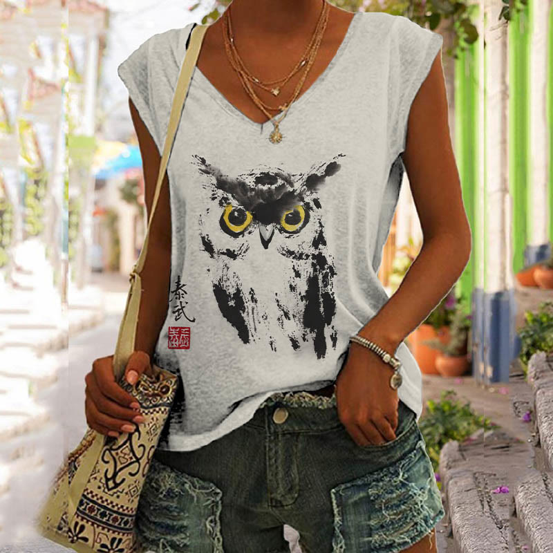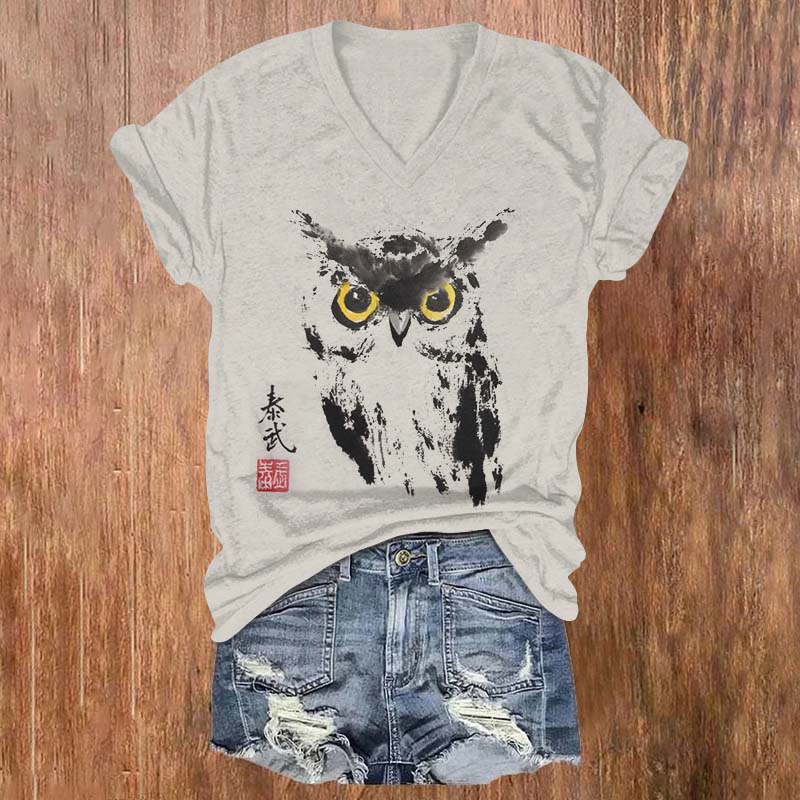 Japanese Owl Ink Painting Print V-neck T-shirt