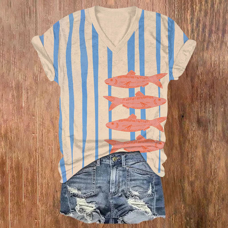 Creative Blue Sketching Fish Art Print V-neck T-shirt