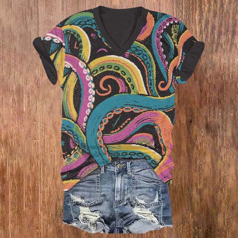 Vintage Mystical Rainbow Octopus Tentacles Print V-neck T-shirt