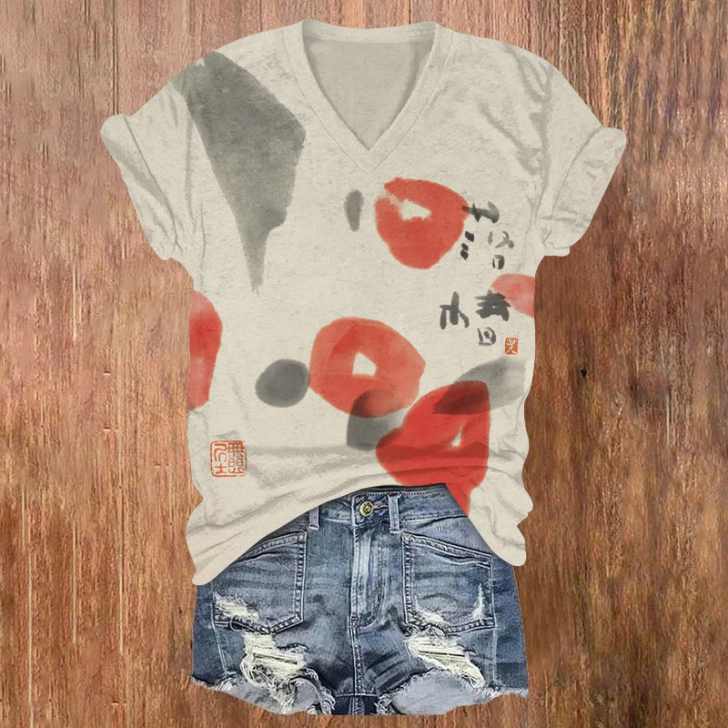 Vintage Plum Blossom Koi Print V-neck T-shirt