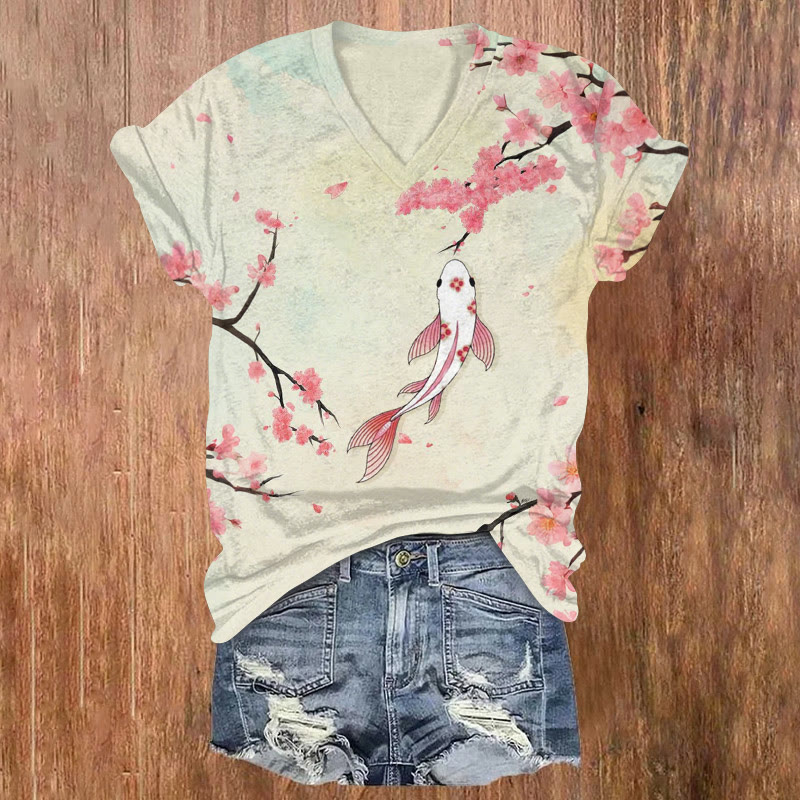 Vintage Japanese Style Floral And Goldfish Art Print T-shirt