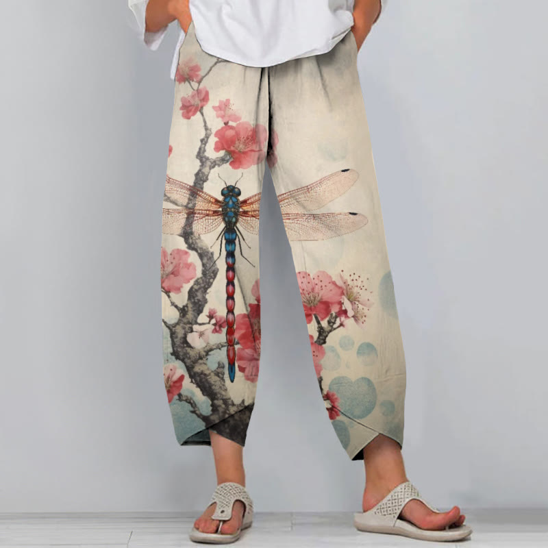 Retro Plum Blossom Dragonfly Japanese Art Print Drawstring Pocket Pants