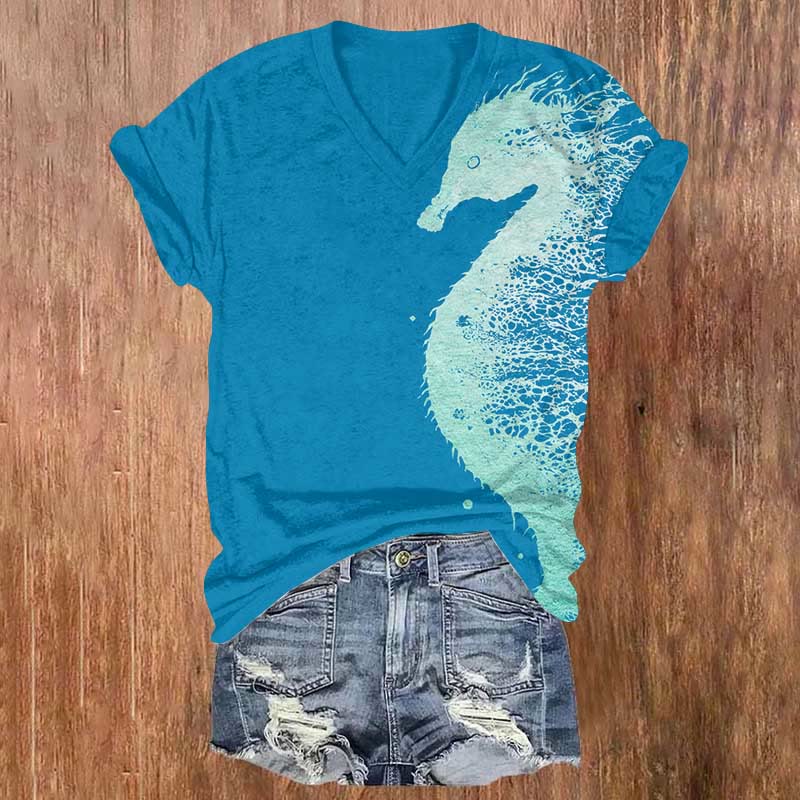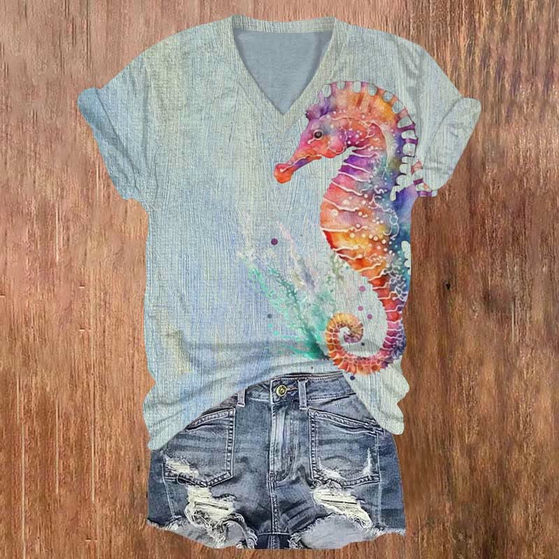 Vintage Abstract Watercolor Seahorse Print T-shirt