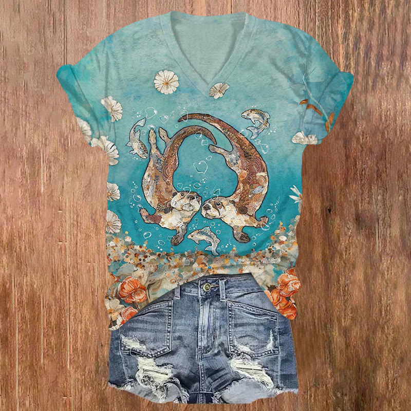 Women's Vintage Ocean Animals Art Printed V-neck T-shirt