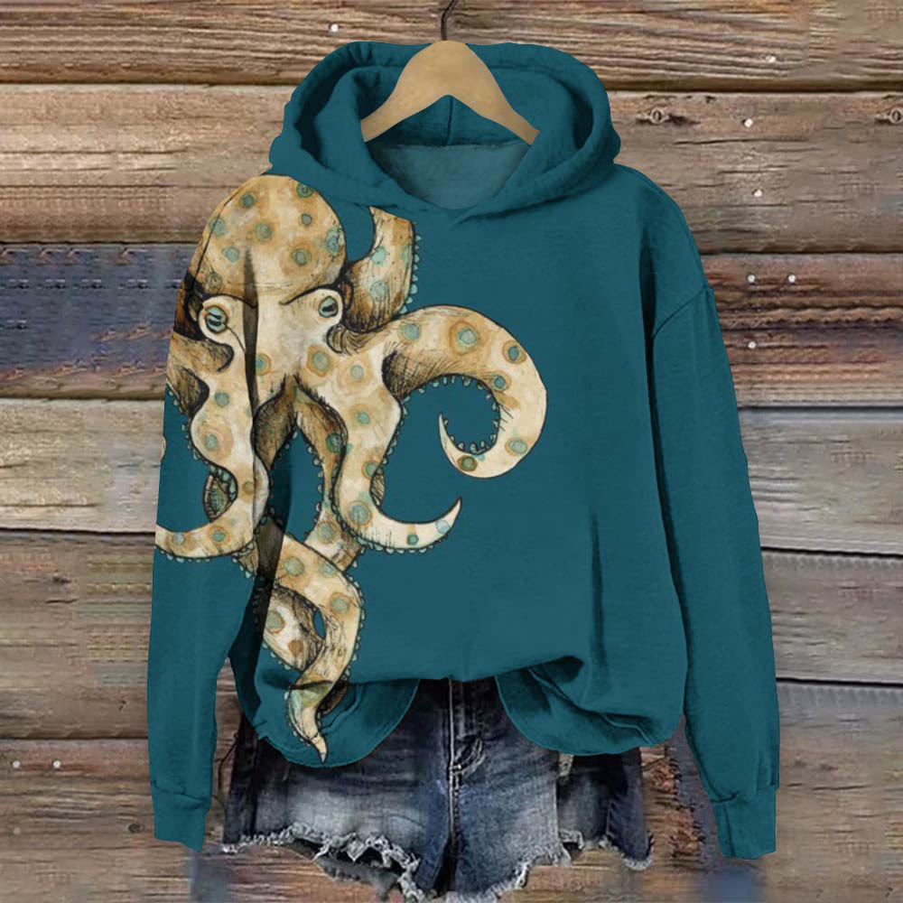 Japanese Casual Octopus Art Print Long Sleeve Hoodie