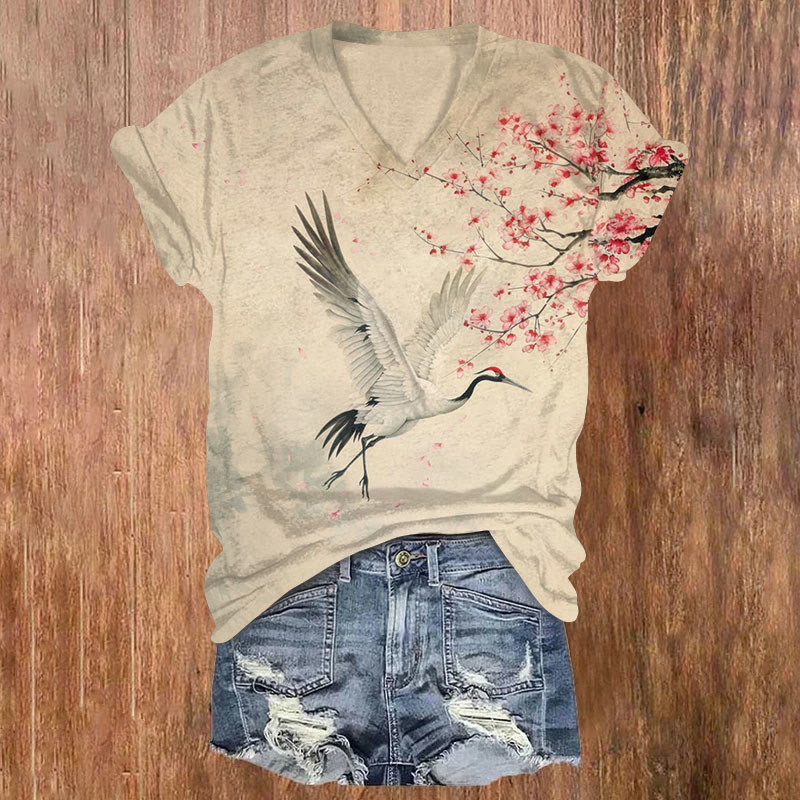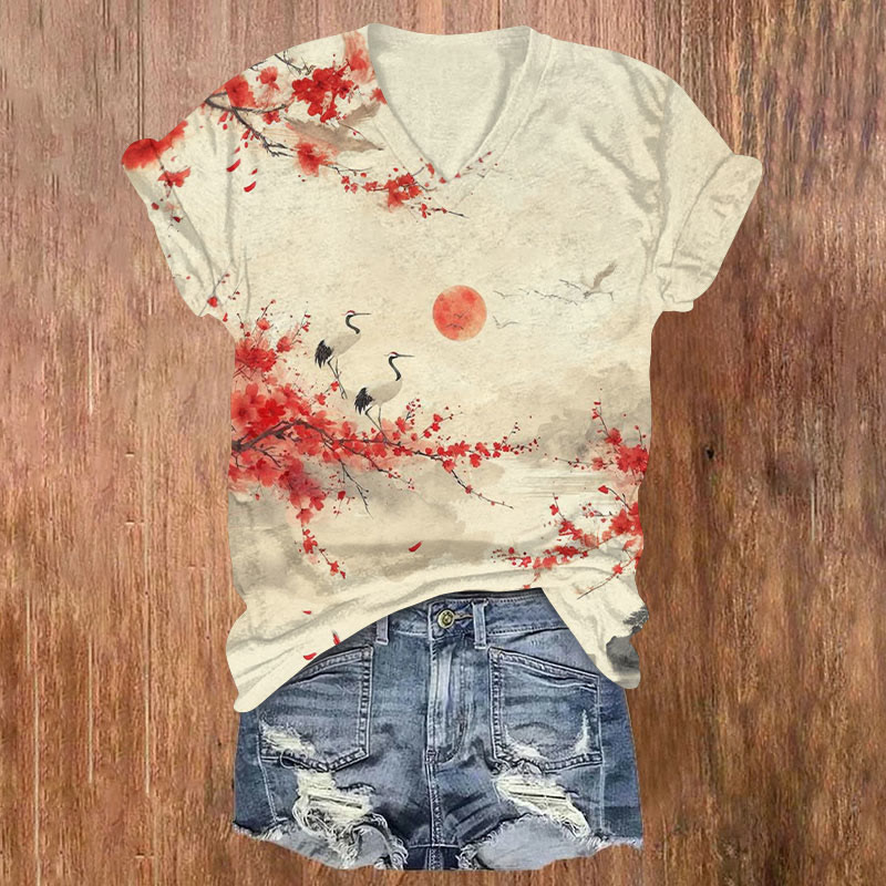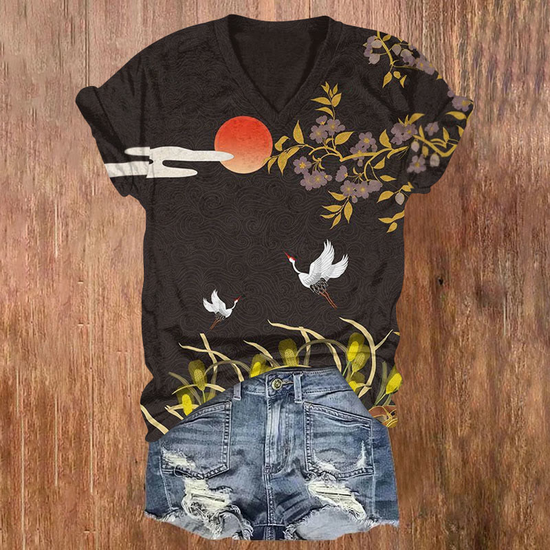 Japanese Style Crane Flowers Print T-shirt