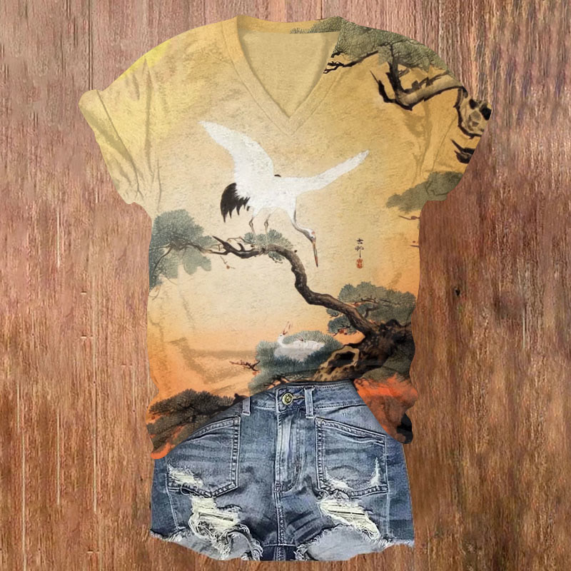 Japanese Style Crane And Pine Tree Print T-shirt