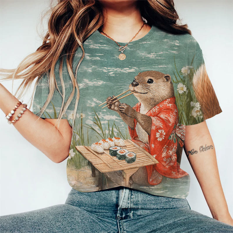 Japanese Kimono Otter Eating Sushi Art Print Casaul T-shirt
