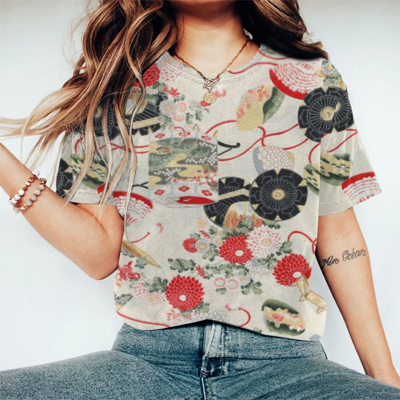 Japanese Retro Traditional Chrysanthemum Art Print Crew Neck T-shirt