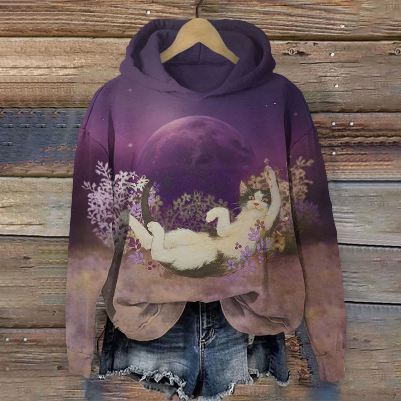 Japanese Style Purple Floral Cat Art Print Long Sleeve Hoodie