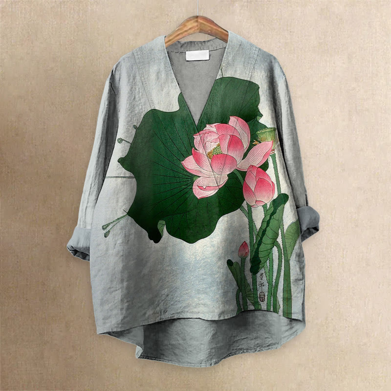 Japanese Vintage Watercolor Lotus Blossom Printed Casual V-neck Blouse