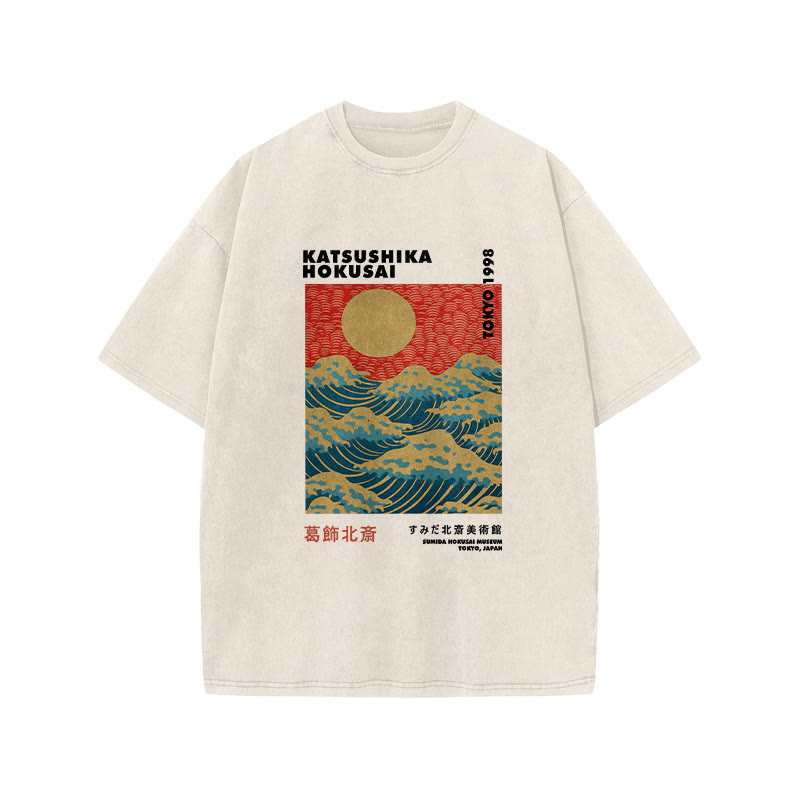 Unisex Cotton Hokkaido Wave Vintage Print Acid Washed T-shirt