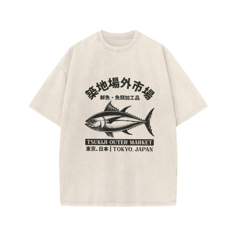 Unisex Cotton Tsukiji Market Vintage Print Acid Washed T-shirt