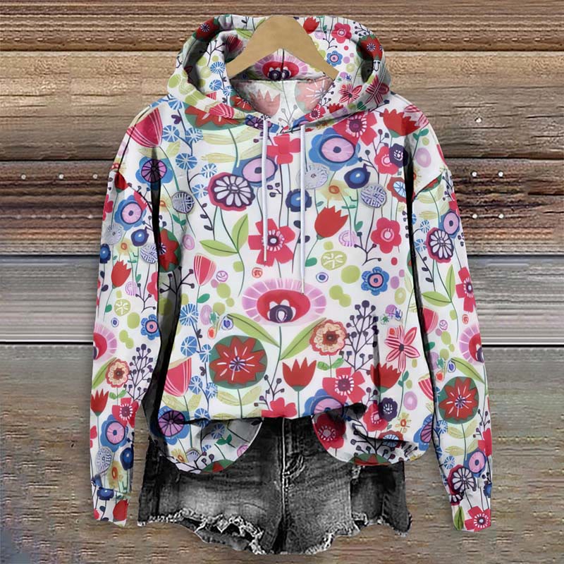 Women's Retro Colorful Floral Art Print Long Sleeve Hoodie