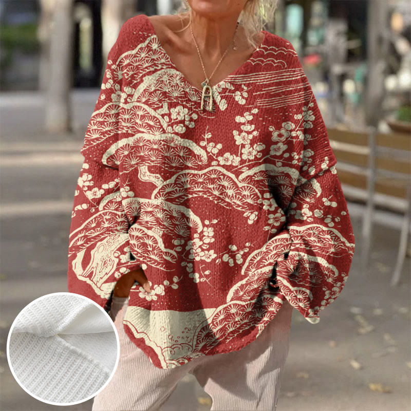 Women's Japanese Art Plum Blossom Art Print V-neck Pullover Sweater