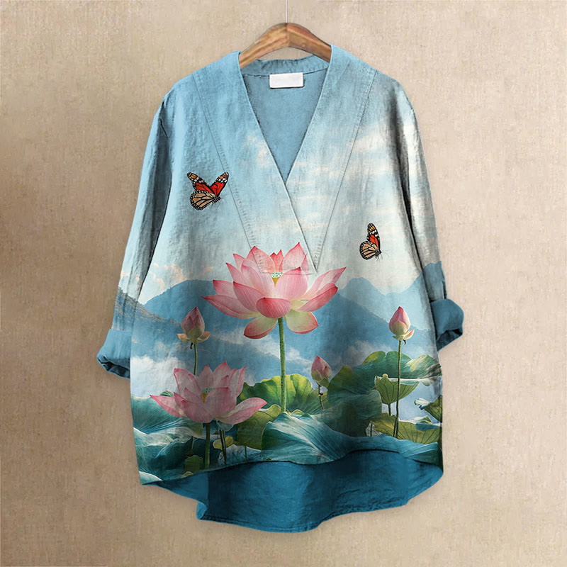 Women's Japanese Daylight Blooming Lotus With Butterfly Printed Casual V-neck Blouse
