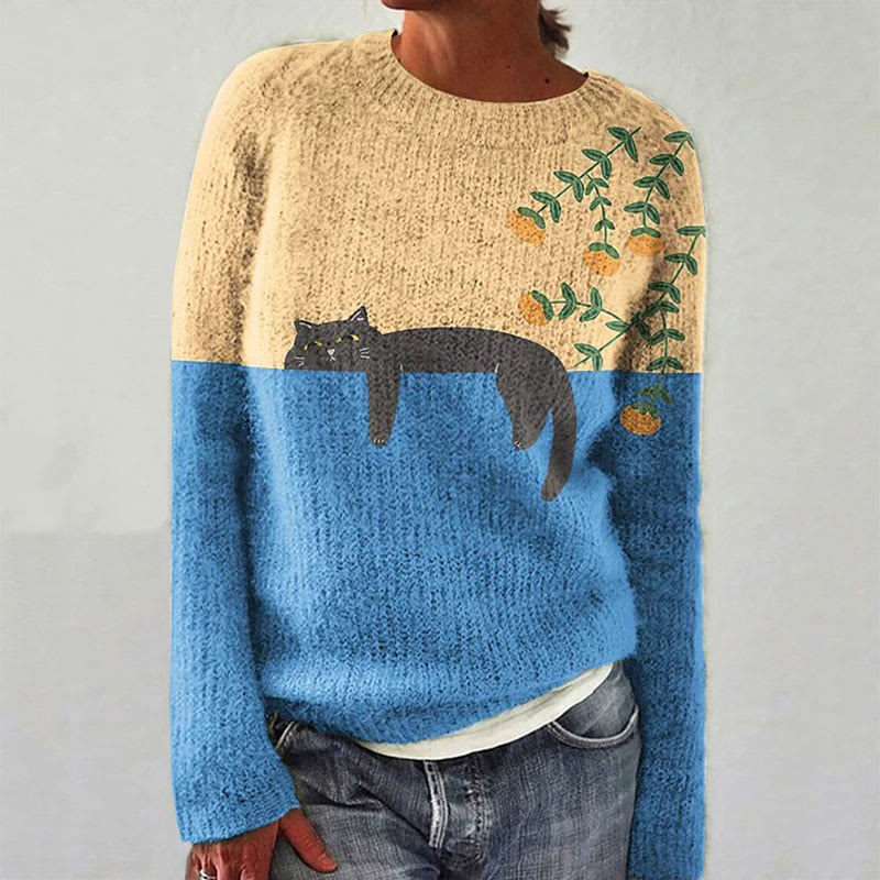 Abstract Creative Lazy Black Cat Painting Art Print Crew Neck Women's Casual Sweater