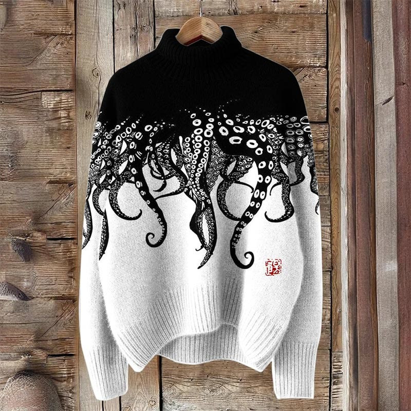 Vintage Japanese Art Octopus Legs Print Turtleneck Pullover Sweater