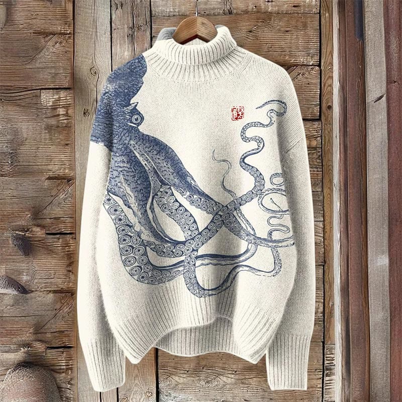 Japanese Art Octopus Print Turtleneck Pullover Sweater