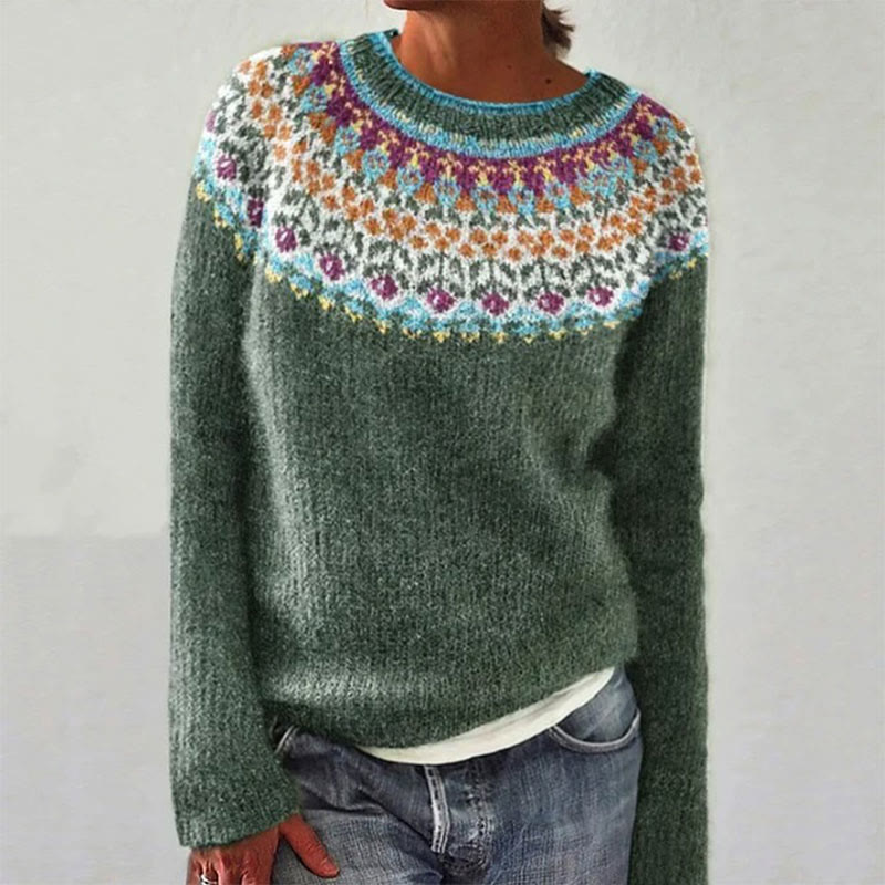 Ethnic Geometric Colorblock Crew Neck Women's Casual Pullover Sweater