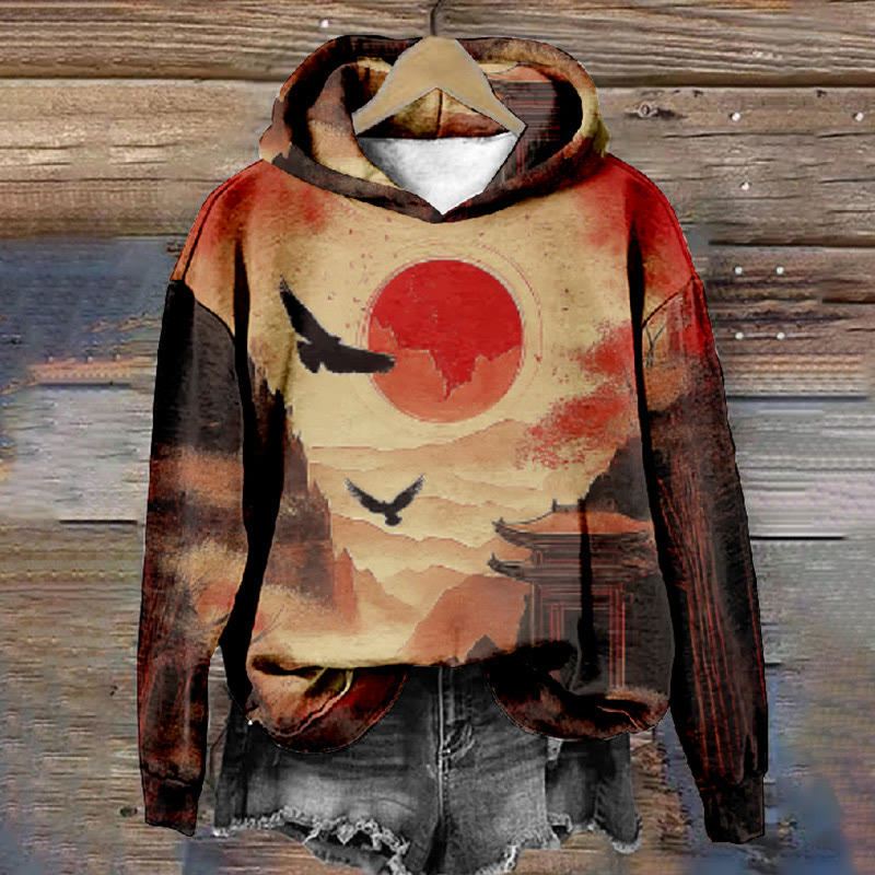 Women's Japanese Nightfall Sun & Eagles Art Print Long Sleeve Hoodie