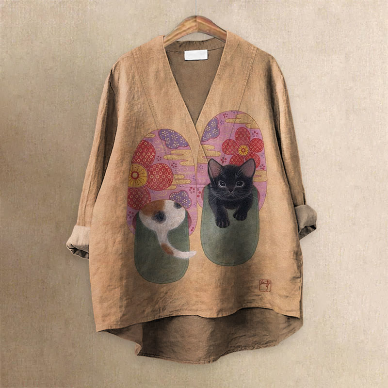 Retro Japanese Art Cat Hiding In Slippers Printed Casual V-neck Blouse