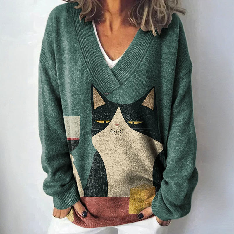 Vintage Cute Cat Print Causal V-neck Pullover Sweater
