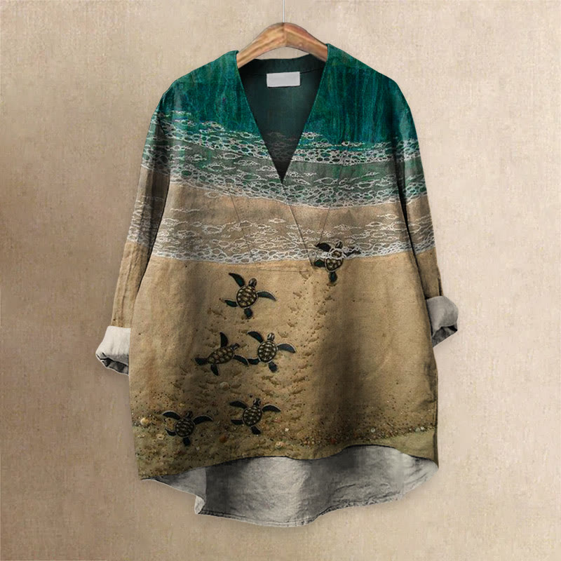 Baby Sea Turtles Beach Fiber Art Print Casual V-neck Blouse