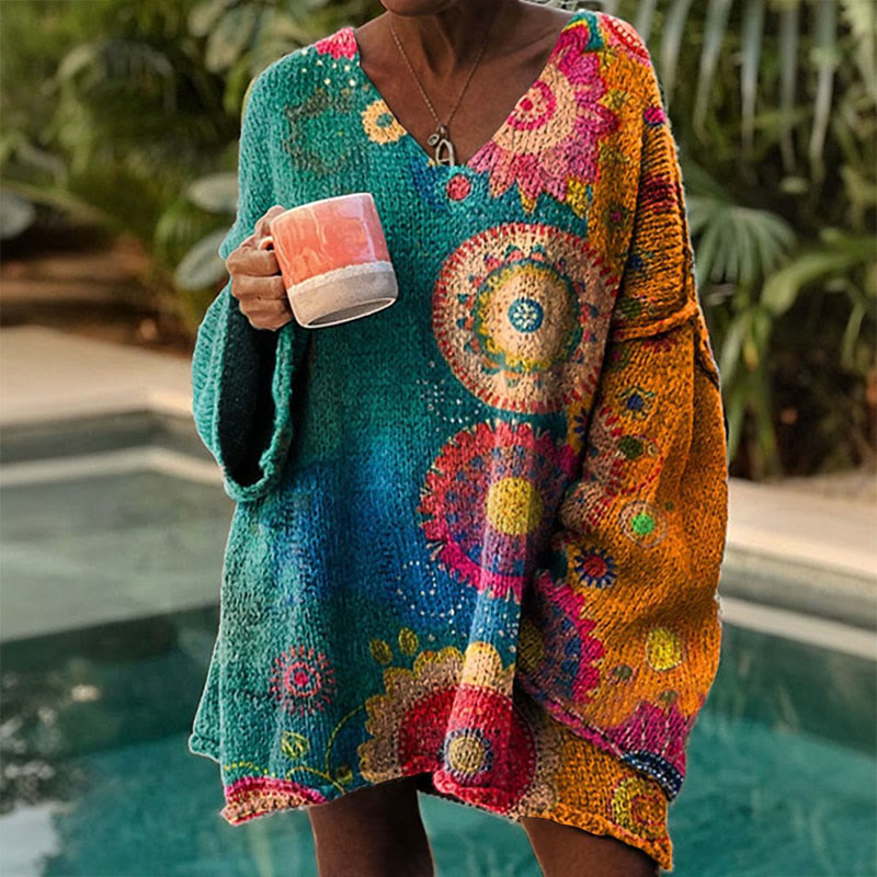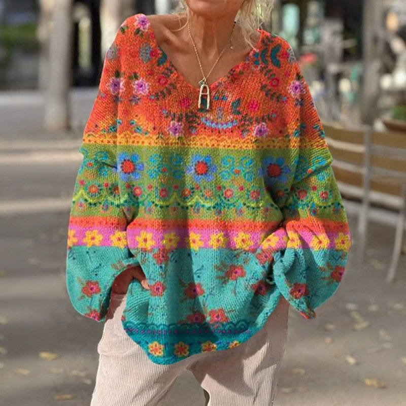 Women's Vintage Multicolor Floral Art Print Causal V-neck Pullover Sweater